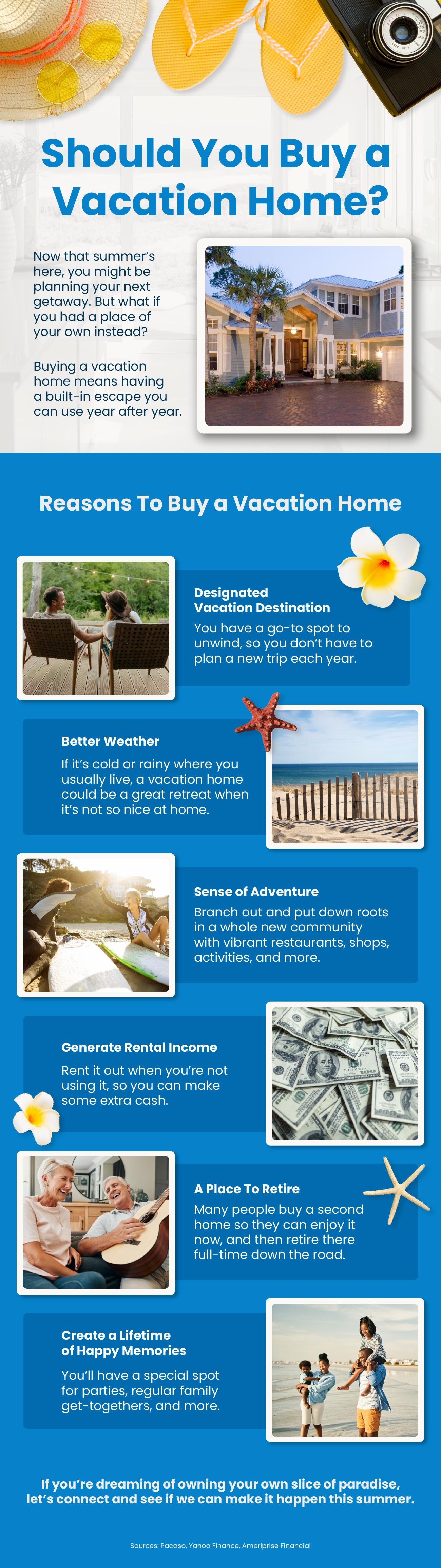 - Buying a vacation home means having a built-in escape you can use year after year. It gives you the chance to generate rental income and have a go-to retirement destination in the future.