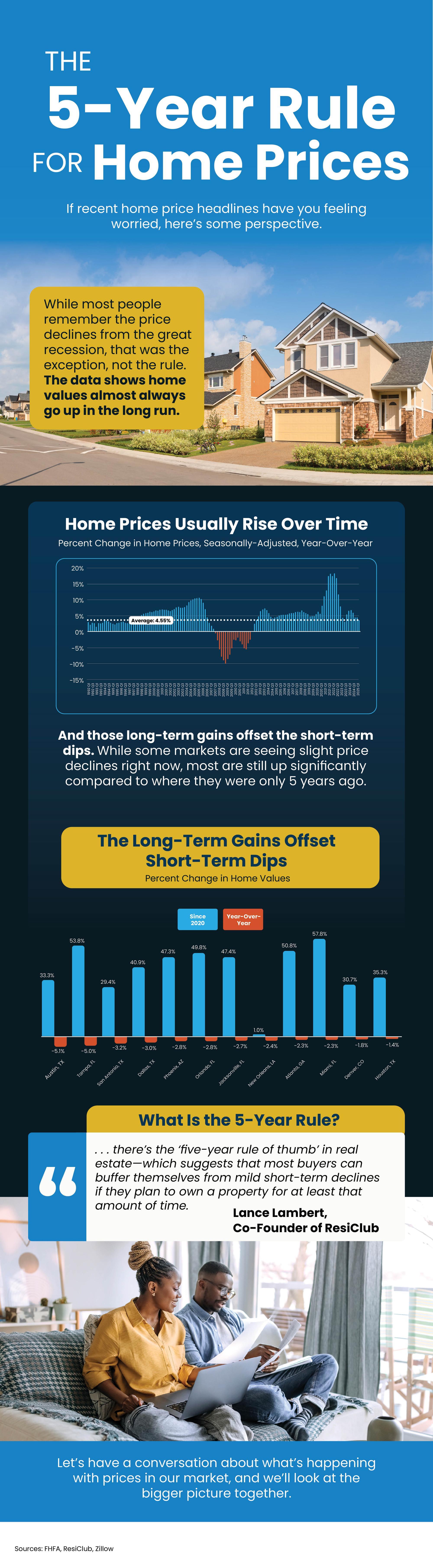 • Home values almost always go up in the long run. ​And the long-term gains offset any short-term dips. Basically, if you plan to live there for 5 or more years, you should be able to buffer yourself against any short-term declines.
